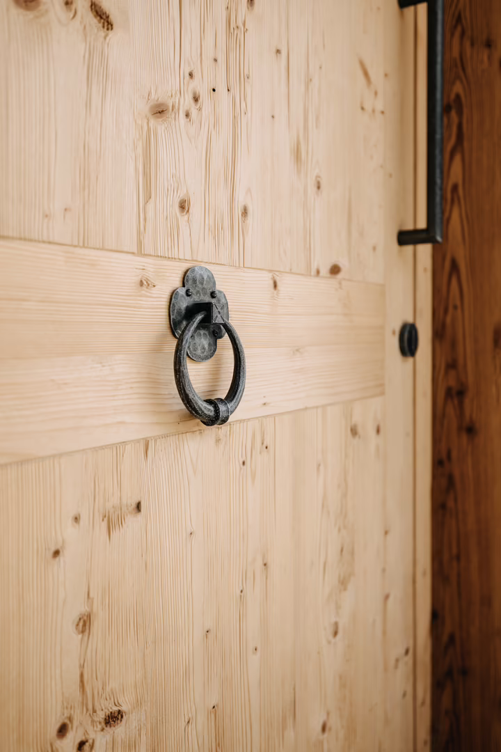 Die Fenster wurden im System RIEDER 92 mit Antik Fichte 3-schicht astig realisiert – außen gehackt und innen gebürstet. Mit dem Fensterwert (Uw) von 0,74 W/m2K ist das Haus thermisch bestens gerüstet. Auch in der Ausführung ging das RIEDER Team auf sämtliche Wünsche ein. So wurden beispielsweise sechs von 17 Fenstern mit aufliegenden Holzsprossen produziert sowie zwei Hebe-Schiebetüren mit großen Glasflächen für eine tolle Aussicht im Erd- sowie im Obergeschoss hergestellt. Einen wahren Blickfang stellen die Haustüren dar. Sie entsprechen den Ideen und Vorstellungen des Bauherrn und bringen das gestalterische Gesamtkonzept des Gebäudes auf den Punkt. Als Holz wurde, wie bei den Fenstern, Antik Fichte gehackt für außen gewählt. Für die Oberfläche der Türinnenseite fiel die Wahl auf Fichte Altholz in Massivholzoptik, gebürstet. Einzigartiges Aussehen verleihen die Beschläge der Haupteingangs-Haustür. In der Mitte wurde ein Türklopfer positioniert. Rechts daneben befindet sich der Zylinder und über diesem ein länglicher Griff. Charaktergebend sind die drei Fenster, oben in der Mitte. Die anderen beiden Eingangstüren wurden beim Kellereingang sowie bei der Wohnung eingebaut. Sie unterscheiden sich marginal zur Haupteingangstür: oben befindet sich jeweils ein Fenster in der Mitte und sie haben keinen Türklopfer.