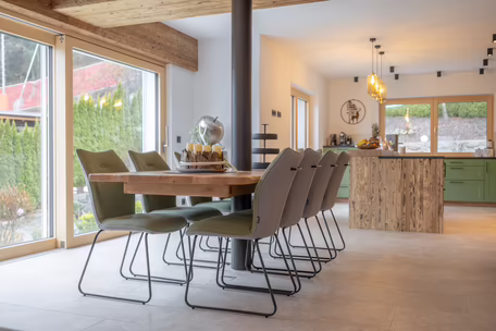 Schon beim Betreten der großzügigen Wohn-Küche fällt das behagliche Zusammenspiel von klarem Design und dem Materialmix aus Eiche und Altholz, Stein und Stahl ins Auge.
