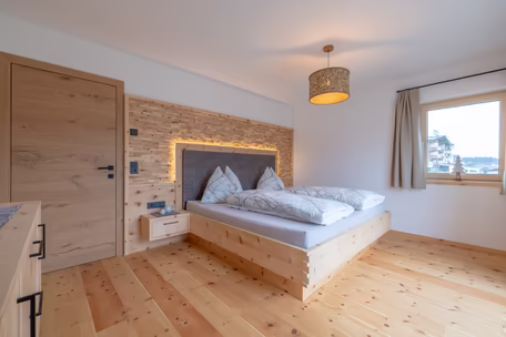 Im Schlafzimmer dominiert die Zirbe – in Form von Landhaus-Bodendielen und handgemachten Möbeln. Das Hauptaugenmerk liegt auf dem Zirbenbett mit gezinkten Eckverbindungen.