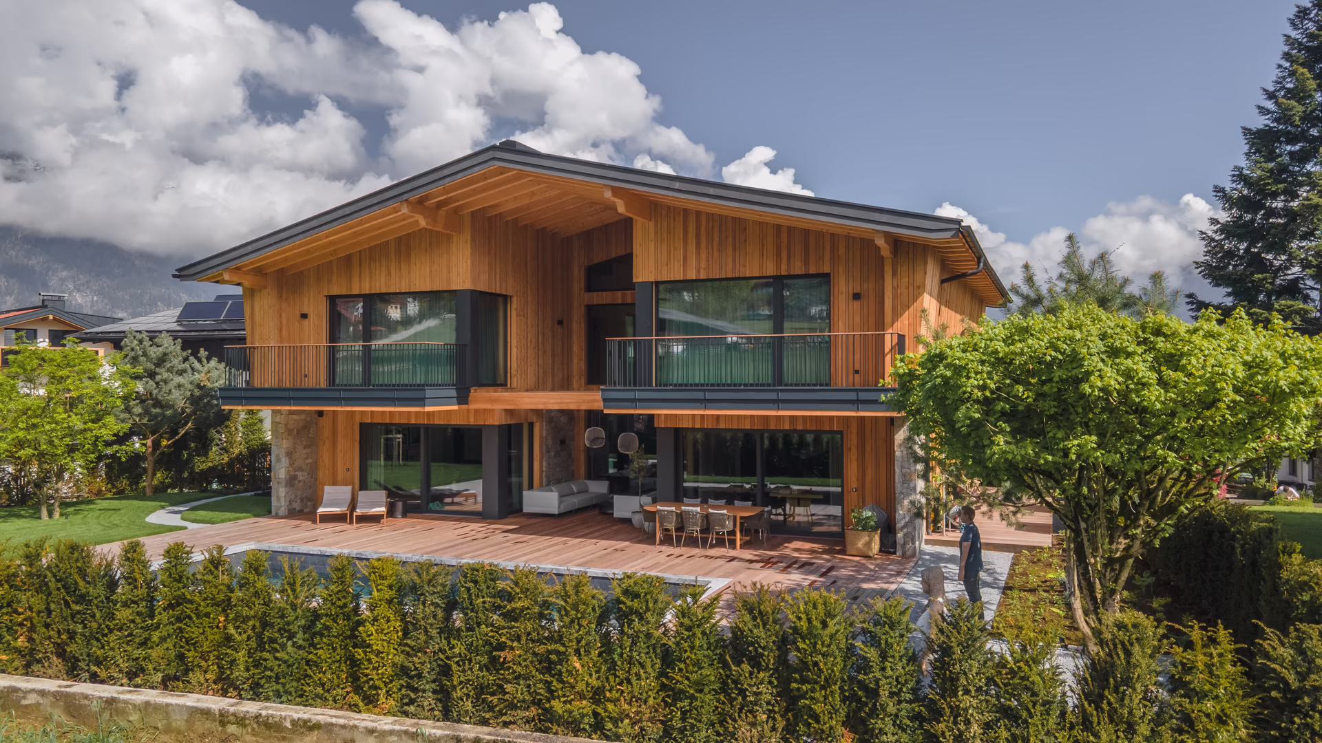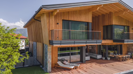 Als besonders charaktergebend präsentiert sich die Fassade. Sie wurde traditionell mit einer vertikalen Schalung in unterschiedlichen Brettbreiten aus hochwertigem heimischen Lärchenholz aus dem Zillertal ausgeführt. An den Gebäudeecken fügen sich harmonisch Natursteine ein. „Uns, als ausführenden Zimmereibetrieb, war es wichtig beim Materialeinsatz auf Regionalität und kurze Transportwege zu achten, um einen ökologischen Fußabdruck zu hinterlassen“, erläutert Stefan Schennach.