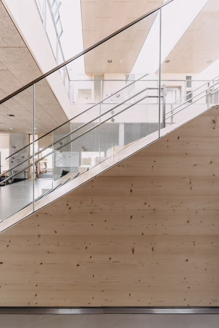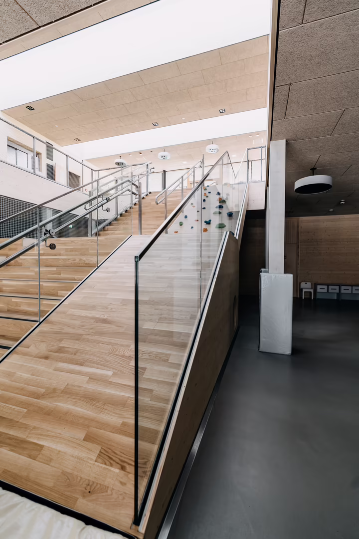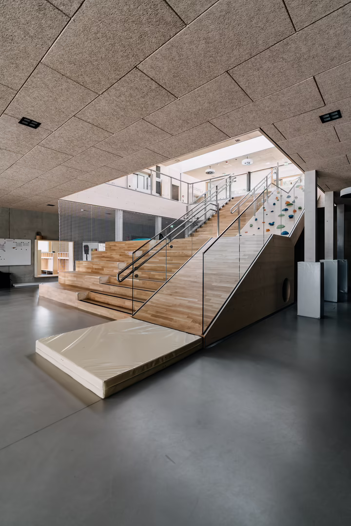 Den Architekten war in ihrer Planungsidee wichtig, ebenso Aspekte zu berücksichtigen, die über ihre Eigenschaften automatisch für mehr Entspannung beim Lernen sorgen. Holz hat eine positive Auswirkung auf unseren Körper und die Leistungsfähigkeit. Unser Holzbau-Team um Bauleiter Thomas Wetscher realisierte die Außenhülle der beiden jeweils circa 730 m² großen Gebäude in Riegelbauweise inklusive Fassaden-Schalung. Eine Besonderheit war zudem die Treppenkonstruktion im Innenbereich des Kindergartens, die vollständig aus Holz gebaut und mit Dreischichtplatten verkleidet wurde. Die integrierte Rutsche, die kleinen Kletterelemente sowie die Spielraumöffnungen unterhalb der Treppe garantieren Spaß ohne Grenzen für die Kinder. Insgesamt wurde in der Innenarchitektur viel Wert auf die Gestaltung mit Holz gelegt, das im Zusammenspiel mit den Betonelementen eine wunderbar moderne als auch warme Atmosphäre schafft und sozusagen mit allen Sinnen erlebbar ist.