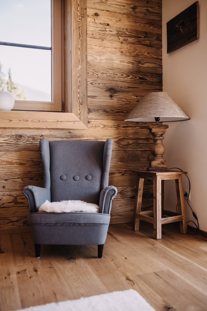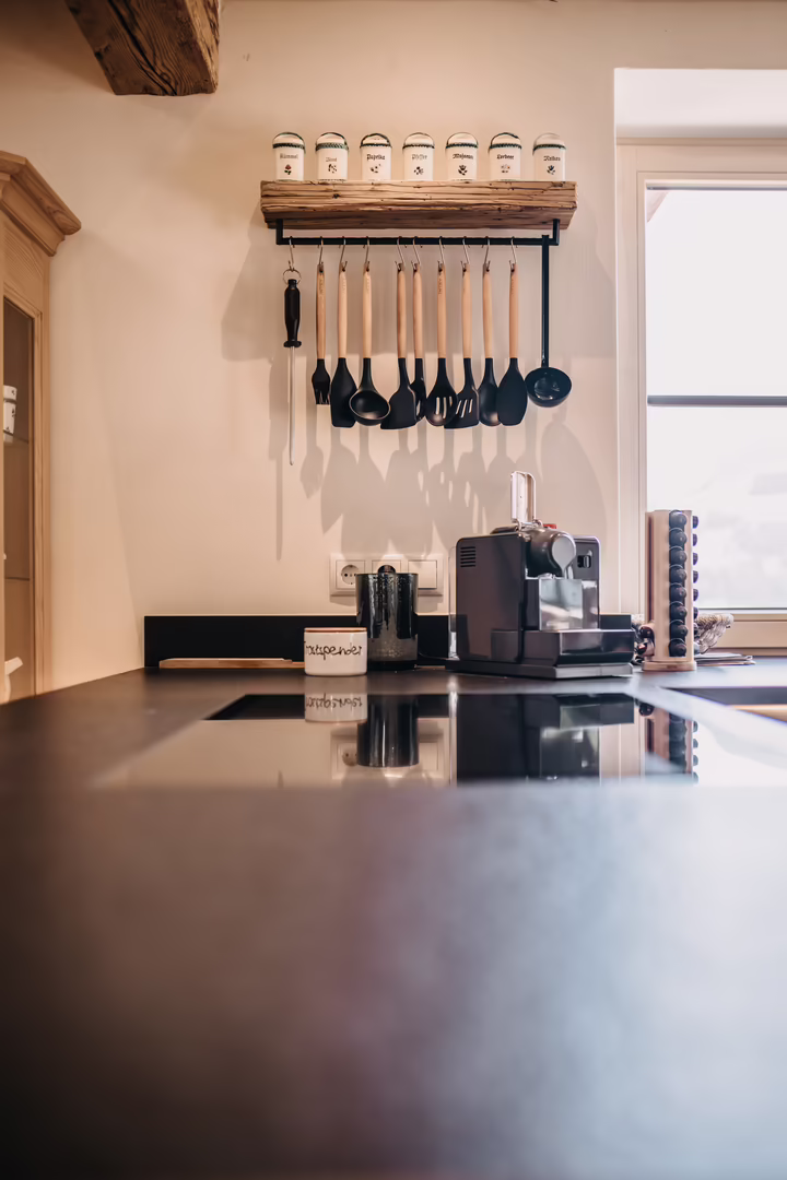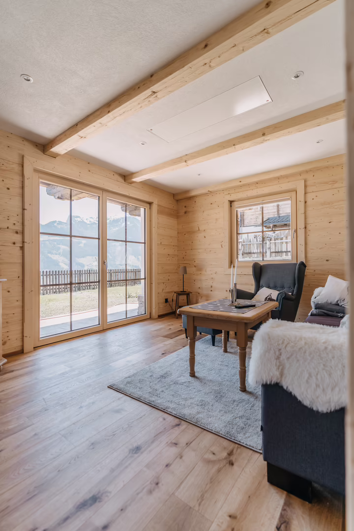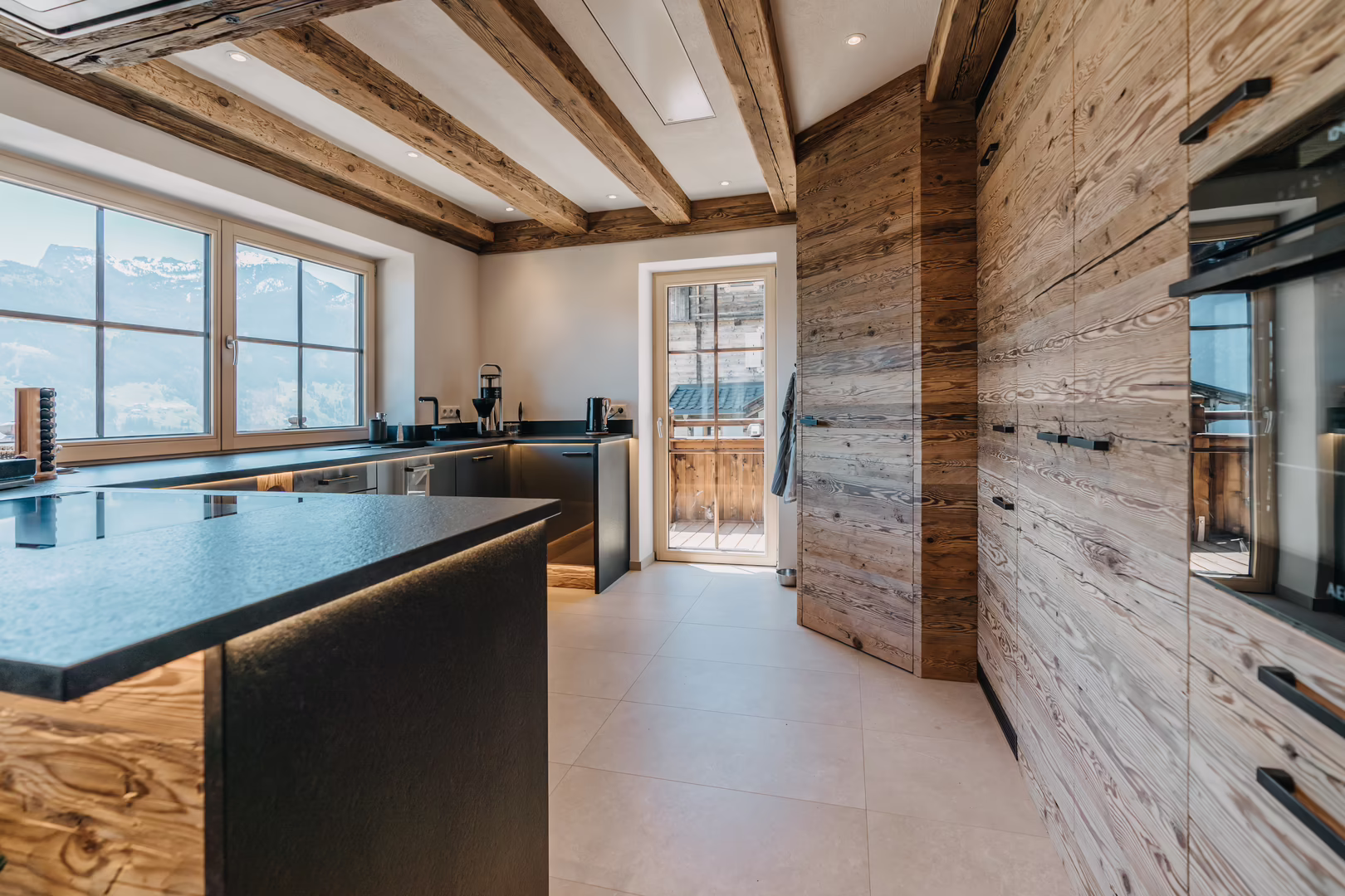 Mit viel Sinn für Ästhetik wurde auch das Interior Design geplant. Wir gestalteten die Wohnküche - zu welcher der Esstisch und die Eckbank in Altholz wunderbar harmoniert - mit allen Annehmlichkeiten, so dass das Kochen richtig Spaß bereitet. Ein durchgehendes Farbkonzept bei den Textilien und Werkstoffen sorgt für einen absolut schicken Look, der nicht aus der Mode kommen wird. Ein wärmender Kachelofen war selbstverständlich ein Muss, um die Wintermonate in Sachen Heimeligkeit noch einmal zu toppen.