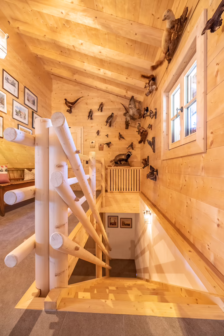 Urig wohnen, modern leben. Die Rüttingers lieben den Charme der Almen: Blockbohlen-Bauweise, kleine Holzsprossenfenster vor welchen das Holz für den Kachelofen aufgeschlichtet wird, eine Haustüre aus Holz und natürlich eine Stube, in der mit Stolz die Jagdtrophäen ausgestellt werden. Das Ehepaar hatte eine genaue Vorstellung von ihrem „Austragshaus“ im Zillertal. So entstand ein Neubau mit einer Patina und einer Anmutung wie aus früheren Zeiten.