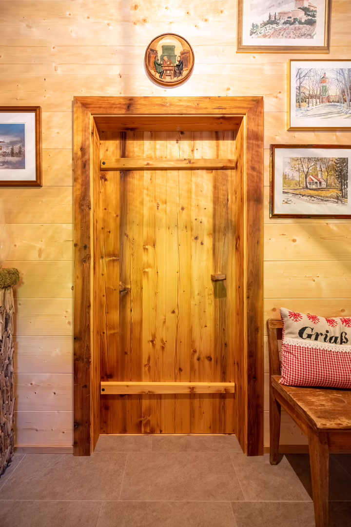 Bei den Fenstern und Türen sowie im Innendesign ist ebenfalls Holz das dominierende Material. Viele Elemente wurden von unserer Zimmerei und der Tischlerei individuell gefertigt. Mit Stilbewusstsein und Liebe zum Detail integrierten wir auf Wunsch der Bauherren eine Stube, die durch alte, gehobelte und gebürstete Bodenbretter, dem schlichten Kachelofen, die abgehängte Holzdecke und der Wandvertäfelung eine enorm gemütliche Atmosphäre bietet. Hier sitzt die Familie sehr gerne länger am Abend beim Hoagascht zusammen. Auch der Rest des Hauses wurde mit Holz durchweg hochwertig und mit bäuerlicher Heimeligkeit designt.
