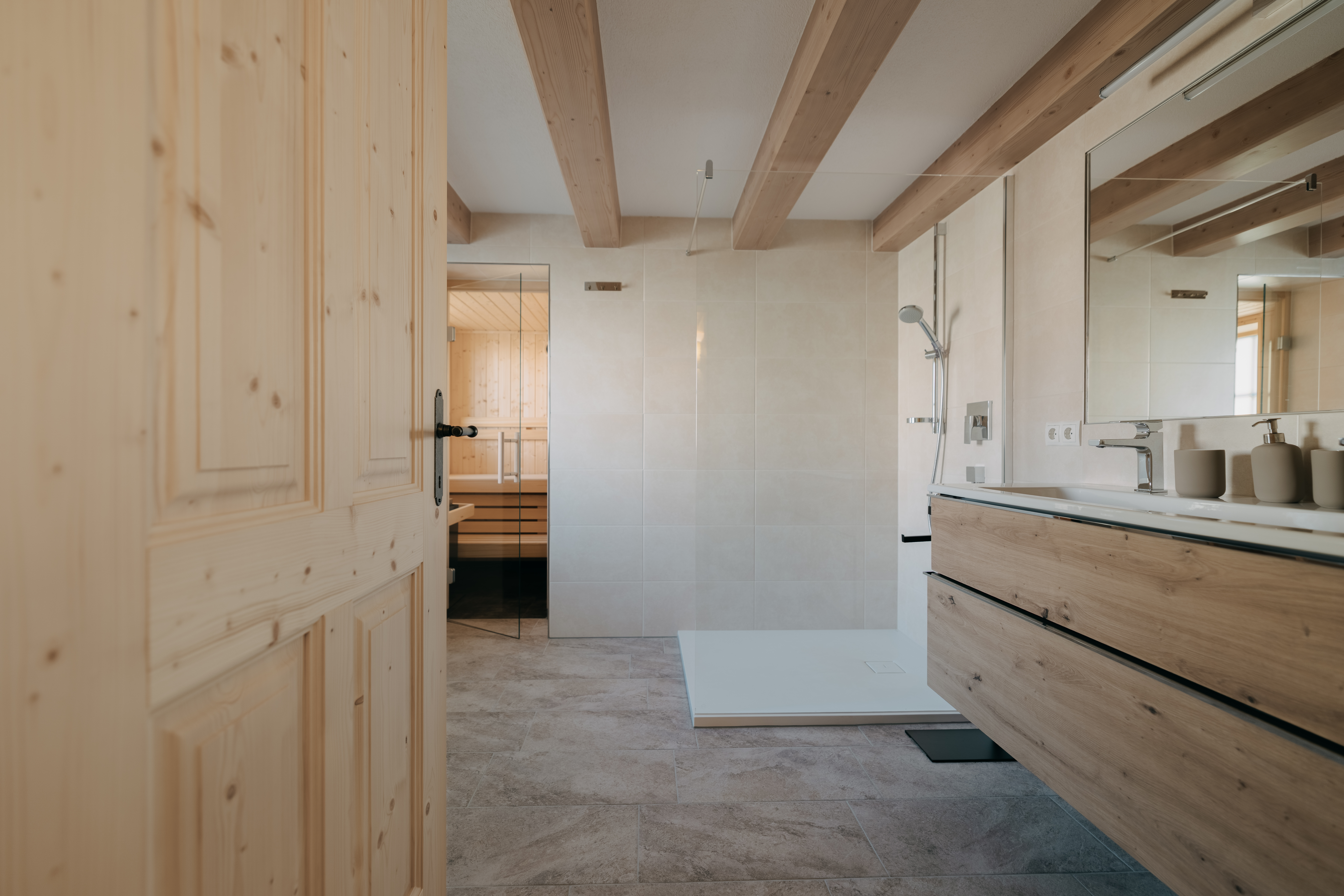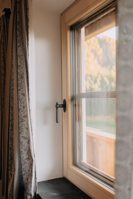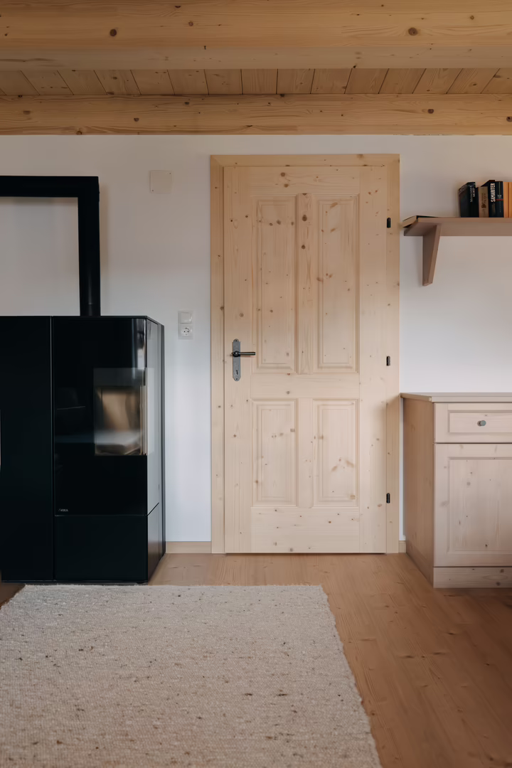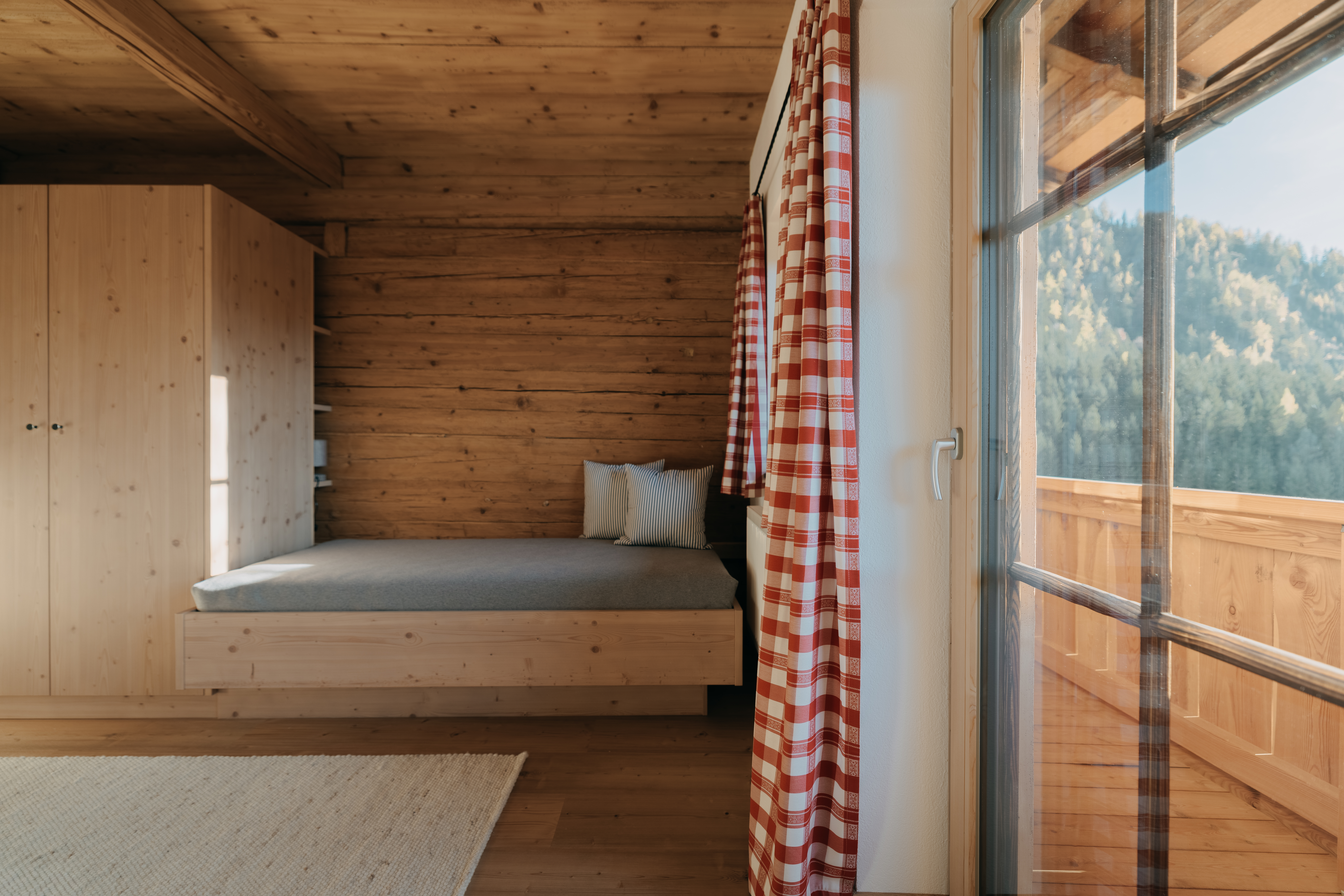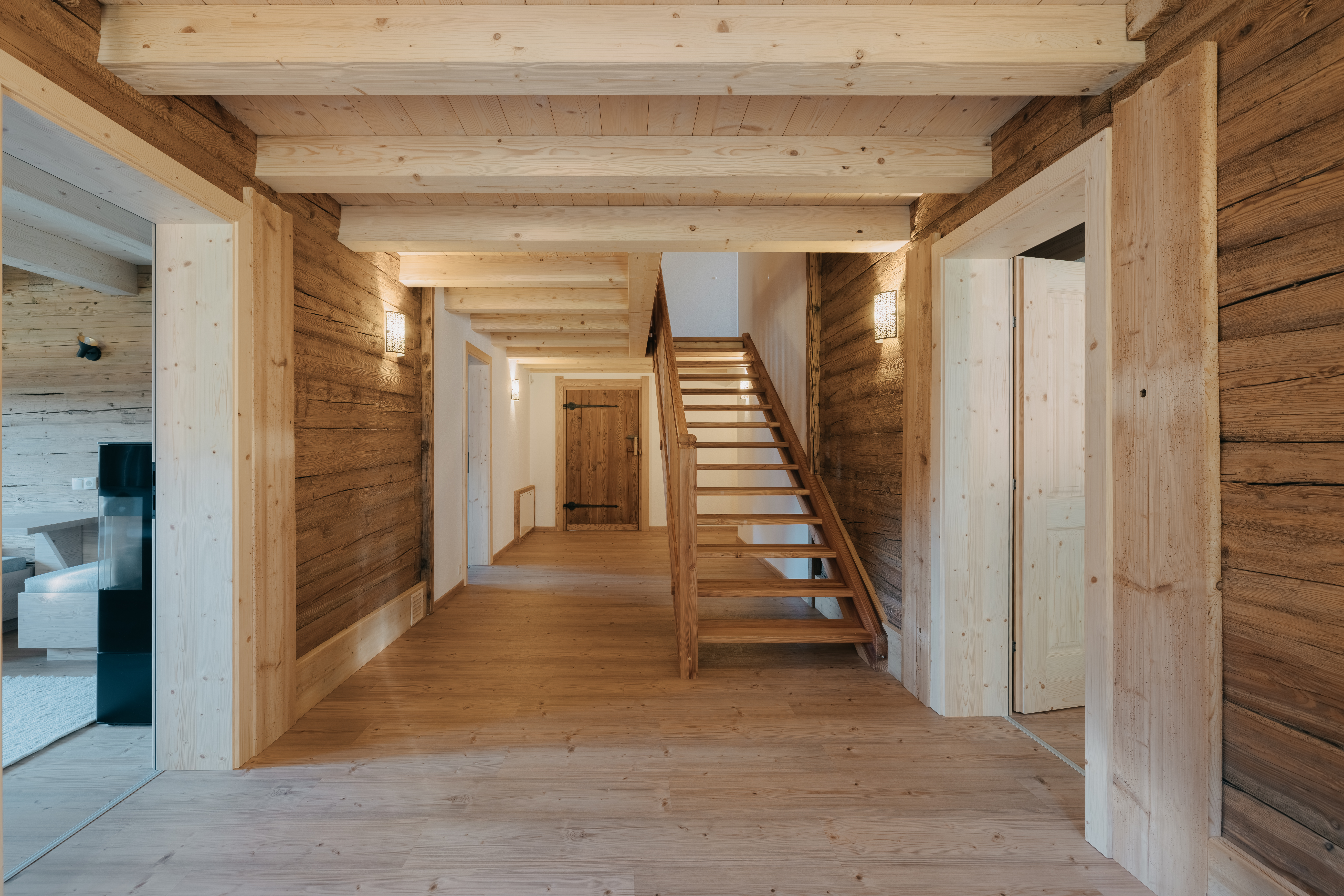 Für Holzbau Fankhauser war das Projekt eine besondere Herausforderung: historische Elemente bewahren und harmonisch mit neuen verbinden. Balkone und Fassadenschalung wurden stilgetreu erneuert, Fenster und Türen passend gestaltet. Innen kamen Tramdecken und Altholz zum Einsatz, ergänzt durch neue Zimmertüren aus Asteiche und schwarze Beschläge. Auch Fenster und Balkontüren aus heimischer Fichte unterstreichen den ursprünglichen Charakter.