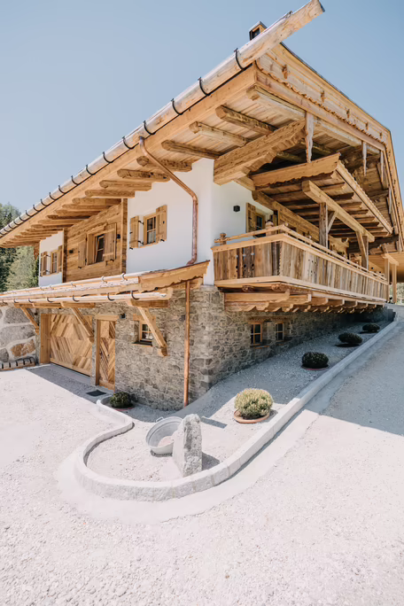 Eingebettet im Karwendelgebirge, in Steinberg am Rofan, finden wir diese zwei romantischen Vollholzhäuser. Der Stil der Einfamilienhäuser passt sich perfekt an die Umgebung an.