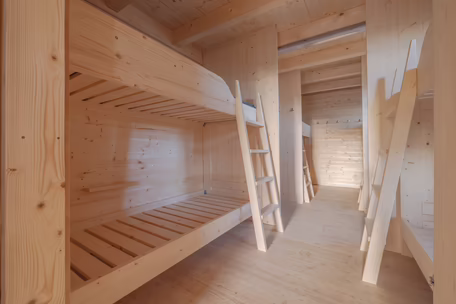 Beim Baustart Ende Juni war Andreas Stöffler mit seinem Hochbau-Team für dieses Bauprojekt zuständig. Die Partie schalte, verlegte Eisen und betonierte die Bodenplatte sowie die zu der hangzugewendeten Wand. Dabei wurde das Material vom Bürstling* Boden aus mit Luftunterstützung mit rund 60 Rotationen absolviert. Die Baumeisterarbeiten wurden innerhalb von zwei Arbeitswochen auf der Hütte vollbracht. Somit wurde das Fundament ordnungsgemäß Anfang Juli an die Zimmerei übergeben. Insgesamt vier Mann errichteten in nur einer Woche die Riegelwände, das Dach und die Fassade. Nun hat diese atemberaubende Hütte auch ein Lager, das ihr gerecht wird!