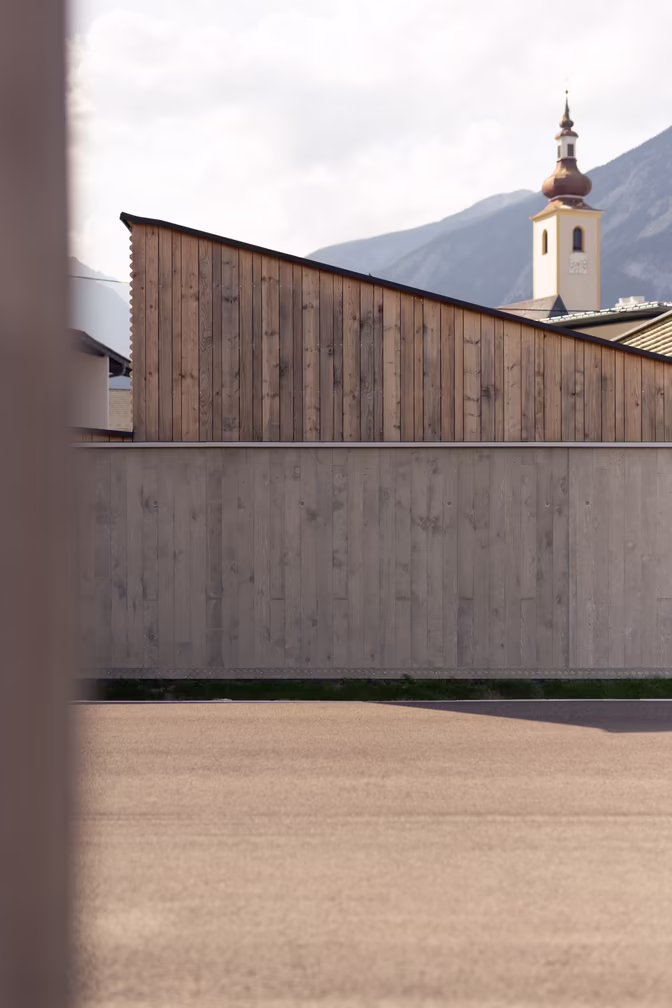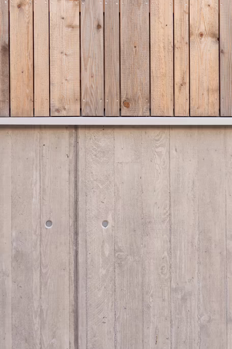 Die seitliche Grenzmauer besteht aus Sichtbeton, der in Bretter-schalung gegossen wurde und so die Holzoptik erhielt. Innen befindensich Schallschutzelemente.