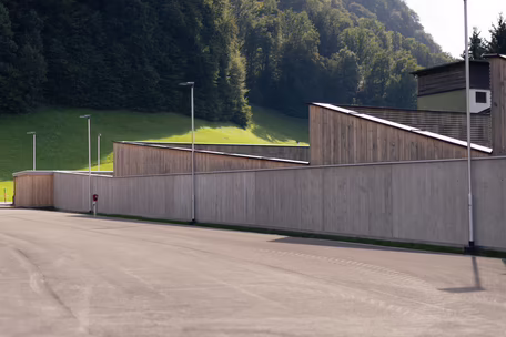 Aus Sicherheitsgründen muss ein Schießstand einen so genann-ten Kugelfang haben. Dieser dient zum Abfangen von durch-schlagenden oder fehlgehenden Geschossen. Das Kugelfangge-bäude des Schießstandes Buch steht ebenfalls auf Bohrpfählen. Die Außenmauer ist in Sichtbeton mit eingelegter Schweinsrücken-schalung ausgeführt. Auf der In-nenseite wurden die Zielscheiben mit Schallschutzelementen angebracht.