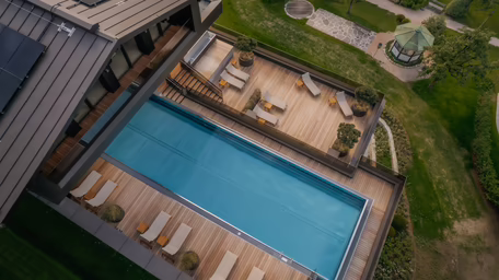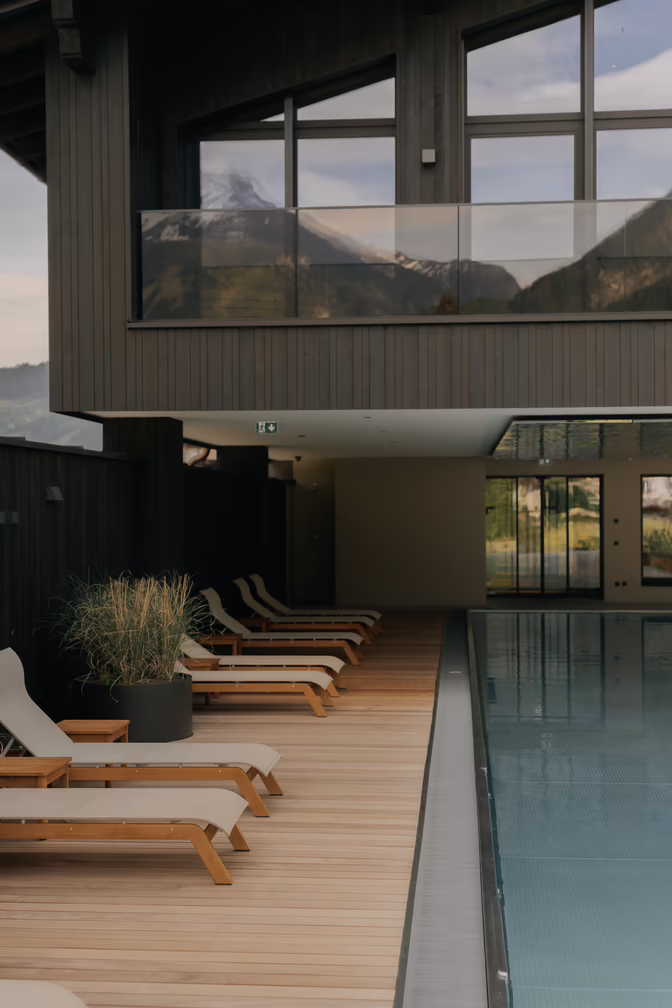 Die Liebe zur Natur und die Verbundenheit zur Heimat spiegelt sich beim neuen Badehaus auch in der Auswahl der Materialien sowie der architektonischen Schrift wider. Holz ist ein Werkstoff, der Wärme ausstrahlt und eine entspannende Wirkung hat. Familie Moigg entschied sich beim Pool-, Wellness- und Ruhebereich außen für Holzdielen, die ebenfalls unser Holzbau Team verbaute.
