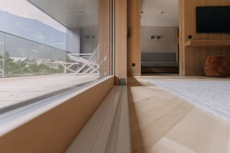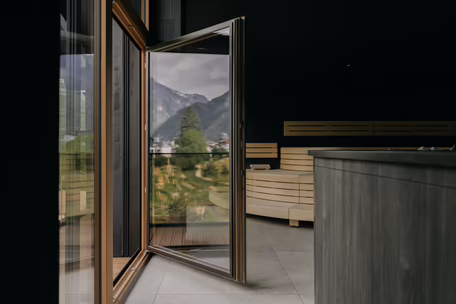 Der Blick raus in die Natur, der die Bilder rein in die Seele zur Entspannung holt, war ein wichtiger Aspekt bei der Gestaltung des Badehauses. Fenster Fuchs, einer unserer Fachhändler für Großprojekte, war, in enger Zusammenarbeit mit dem Architekturbüro Geisler & Trimmel GmbH, der vertrauensvolle Ansprechpartner für Familie Moigg. Von der Beratung über das Aufmaß bis hin zur passgenauen Montage der Fenster stellte Fensterfachmann Max Nothegger, gemeinsam mit unserem Team, den reibungslosen Ablauf und termingerechten Einbau sicher. Insgesamt umfasste das Fenstervolumen eine beachtliche Anzahl von Hebe-Schiebetüren, Fenstern, großen Giebelelementen und eine Panoramascheibe. Die Holz-Alu-Fenster RIEDER HA98 wurden in der Alu-Lackierung RAL 6768 Braun Premium und in der Holzart Douglasie bestellt. Weitere Besonderheiten sind die verdeckt liegenden Beschläge und außen die flächenbündige Ausführung. Um den Baufortschritt für alle anderen Gewerke sicherzustellen, wurden Blindstöcke montiert. Ein optimaler Vorteil auch für unser Holzbau Team, das mit der Fassadengestaltung beim Anbau beauftragt war.