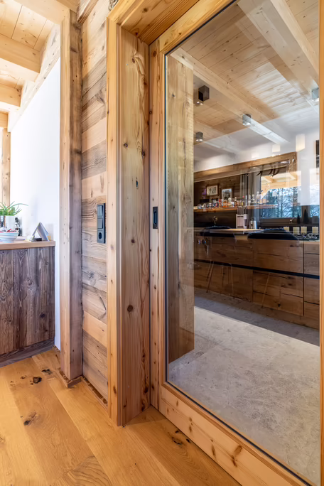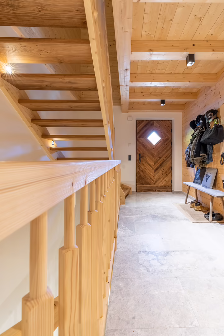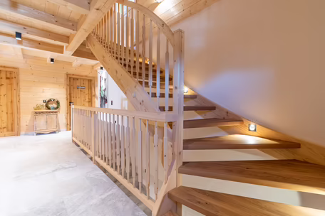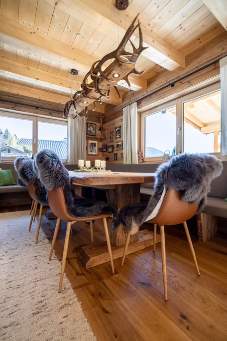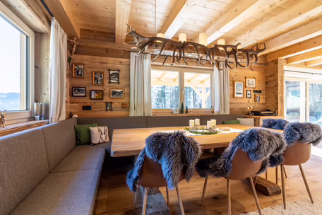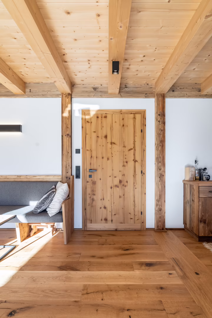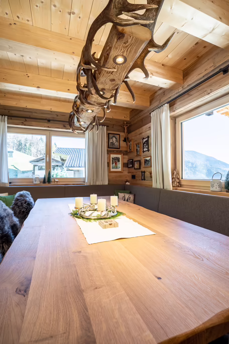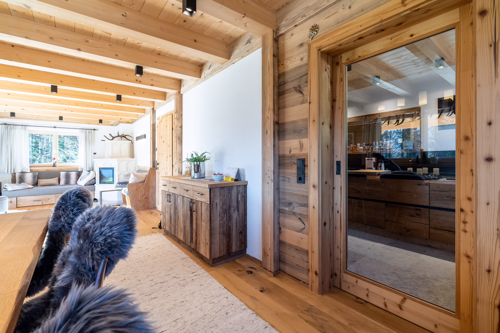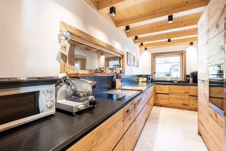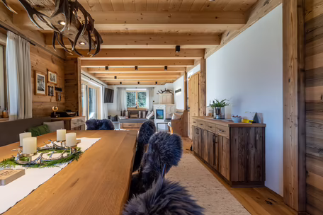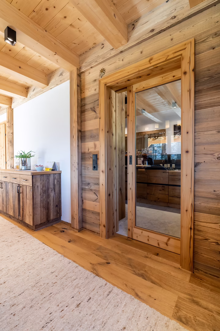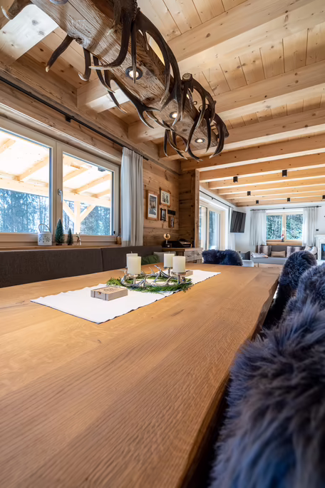 Unser Team rund um Josef Wibmer plante für Viktor das Haus, in dem er sich künftig gemeinsam mit seiner Familie wohlfühlen soll. Durch die langjährige Erfahrung unserer Kollegen, konnte sowohl die Genehmigung für den Abriss des Altbestandes mit Freizeitwohnsitzwidmung als auch die Freigabe des Planes für den Neubau relativ zügig und hürdenlos erlangt werden. Dann ging’s schon los. RIEDER Zillertal übernahm den Bau des Kellergeschosses aus Beton sowie die Tiefbauarbeiten. Der Rohbau erfolgte dann in Holzblockbauweise. Viktor war es wichtig, dass die Außensicht des Holzes in Fichte natur gehalten wird. Im Innenausbau wurde mit Altholz ein urig modernes Flair geschaffen. Die Zwischenwände sind ebenfalls in Blockbauweise errichtet. Bei den Fenstern und Türen vertraute Viktor unserem Qualitätsanspruch. Die circa 150 Quadratmeter große Wohnfläche erstreckt sich auf Erdgeschoss und ersten Stock. Viktors Wunsch war es - anders als bei vielen Wohnbereichen mittlerweile üblich – dass die Küche vom restlichen Wohn- und Essbereich getrennt ist. Die kleine, feine Küche wurde von unserer Tischlerei nach Maß angefertigt und präzise installiert. Der Esstisch und das Wohnzimmer liegen sich kommunikativ offen gegenüber. Der Kachelofen im Wohnbereich ist hier ein schönes Highlight des weitläufigen Raumes.