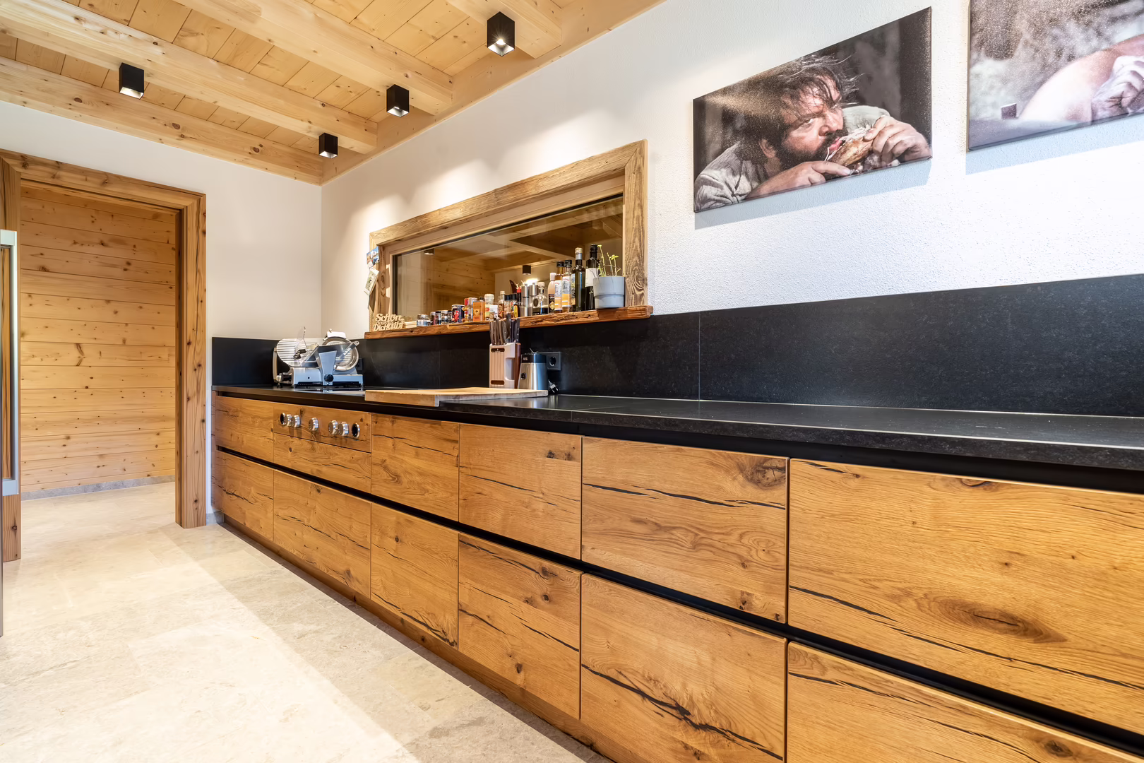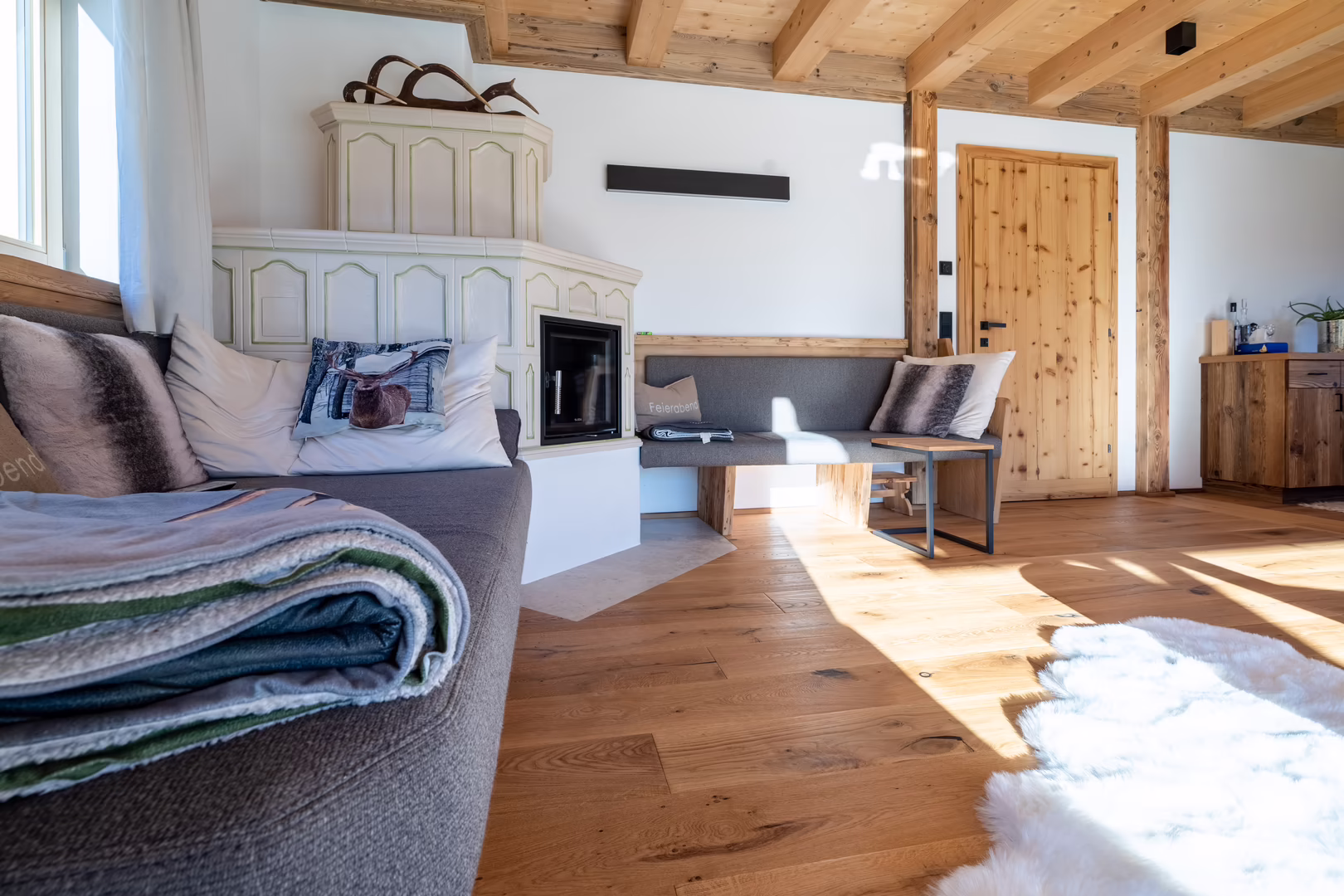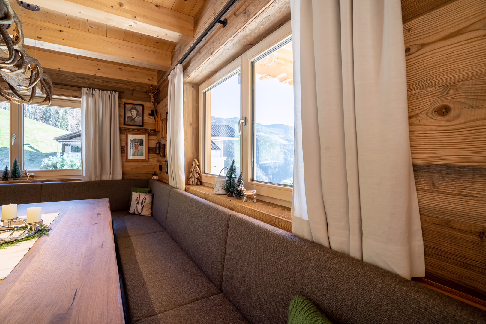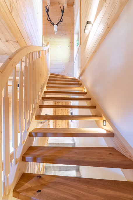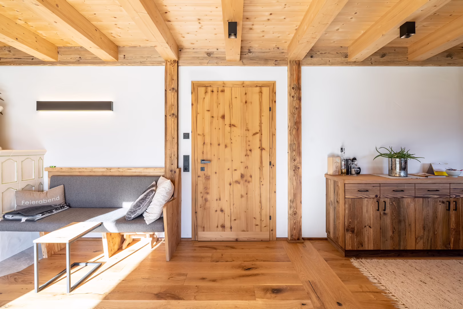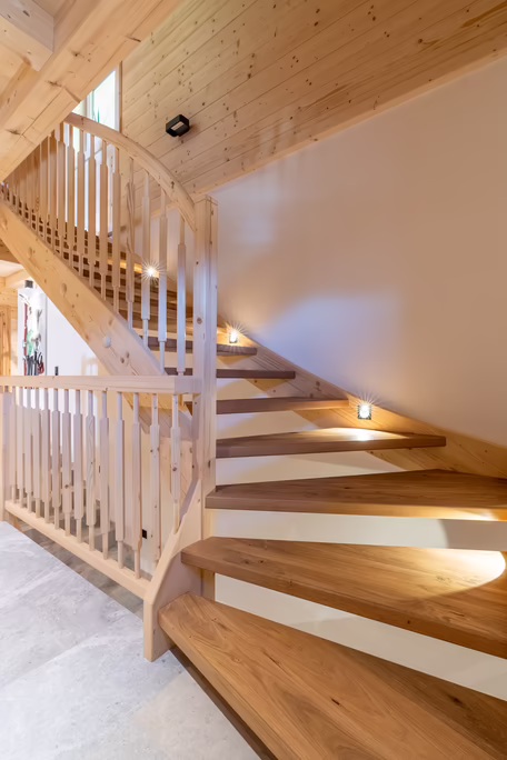 Unser Team rund um Josef Wibmer plante für Viktor das Haus, in dem er sich künftig gemeinsam mit seiner Familie wohlfühlen soll. Durch die langjährige Erfahrung unserer Kollegen, konnte sowohl die Genehmigung für den Abriss des Altbestandes mit Freizeitwohnsitzwidmung als auch die Freigabe des Planes für den Neubau relativ zügig und hürdenlos erlangt werden. Dann ging’s schon los. RIEDER Zillertal übernahm den Bau des Kellergeschosses aus Beton sowie die Tiefbauarbeiten. Der Rohbau erfolgte dann in Holzblockbauweise. Viktor war es wichtig, dass die Außensicht des Holzes in Fichte natur gehalten wird. Im Innenausbau wurde mit Altholz ein urig modernes Flair geschaffen. Die Zwischenwände sind ebenfalls in Blockbauweise errichtet. Bei den Fenstern und Türen vertraute Viktor unserem Qualitätsanspruch. Die circa 150 Quadratmeter große Wohnfläche erstreckt sich auf Erdgeschoss und ersten Stock. Viktors Wunsch war es - anders als bei vielen Wohnbereichen mittlerweile üblich – dass die Küche vom restlichen Wohn- und Essbereich getrennt ist. Die kleine, feine Küche wurde von unserer Tischlerei nach Maß angefertigt und präzise installiert. Der Esstisch und das Wohnzimmer liegen sich kommunikativ offen gegenüber. Der Kachelofen im Wohnbereich ist hier ein schönes Highlight des weitläufigen Raumes.