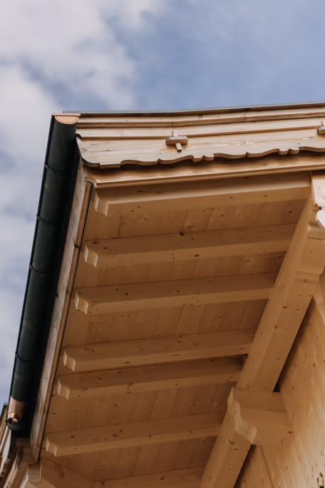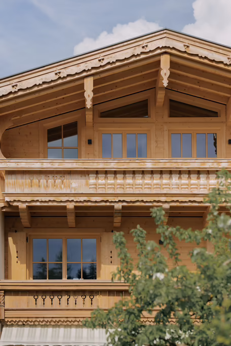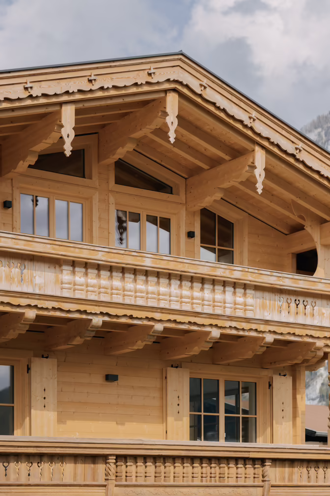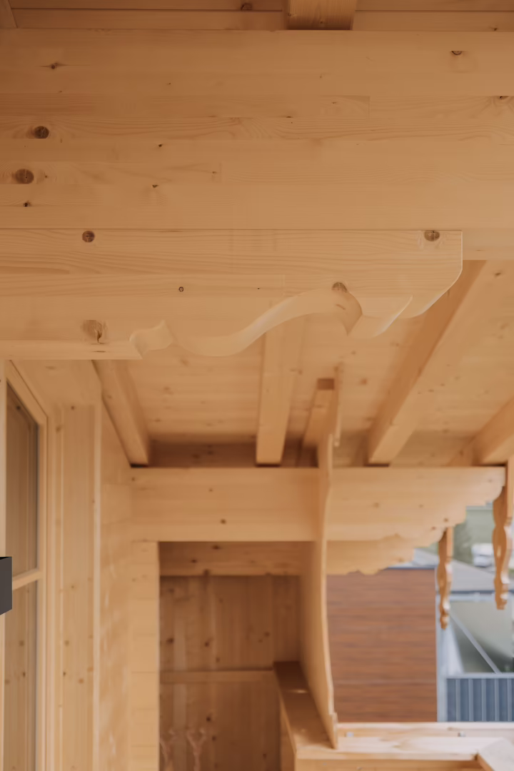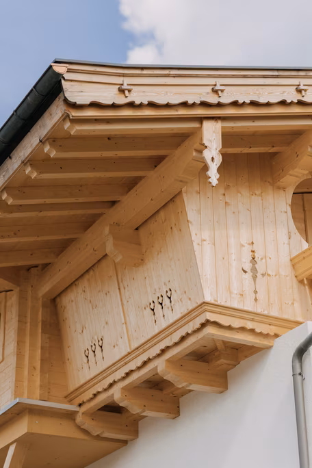 Aufwändige Schnitzarbeiten, wie gezopfte Balustraden, und sorgfältig gestaltete Ausschnitte charakterisierten die Fassade des elterlichen Einfamilienhauses. Mit Respekt und Bewusstsein für die hohe Qualität dieser Arbeit, wurden diese künstlerischen Details im aufgestockten, zweiten Stockwerk wiedergegeben. Das äußere Gesamtbild wurde im regionaltypischen Landhausstil realisiert und präsentiert sich harmonisch-schön.