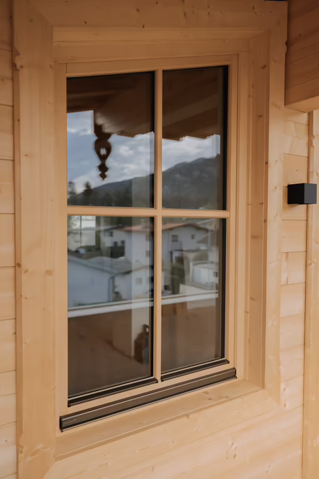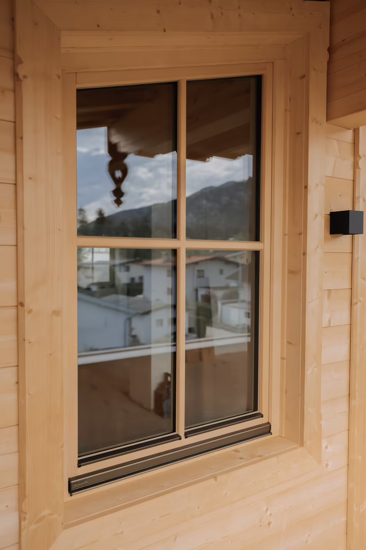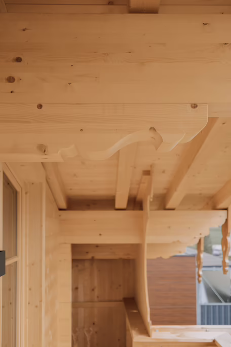 Für die Verkleidung der Fassade fieldie Wahl auf Fichte Natur. Damit die Außenansicht des Gebäudes insgesamt harmonisch wird, wurden die feinen Holzarbeiten beim Neubau zum größten Teil vom Bestand kopiert und wiedergegeben – die Windläden, der Balkonverbau und natürlich der Balkon selbst sprechen für sich. Beim ersten Obergeschoss wurde der Balkon sandgestrahlt, die Fassade neu verschalt sowie mit Fensterläden bestückt. Passend dazu wählte der Bauherr für die beiden Obergeschosse RIEDER Fenster in Fichte Natur tauchgrundiert, 3-fach-verglast mit Fixsprossen innen und außen. Die Giebelfenster sorgen für noch mehr Tageslicht in den Innenräumen. Seit Oktober 2024 sind die Zimmermannsarbeiten abgeschlossen und die Aufstockung fügt sich homogen ins Dorfbild ein.