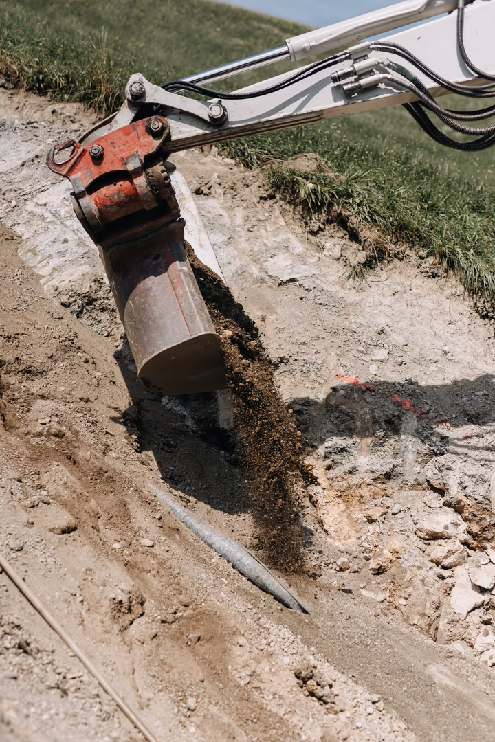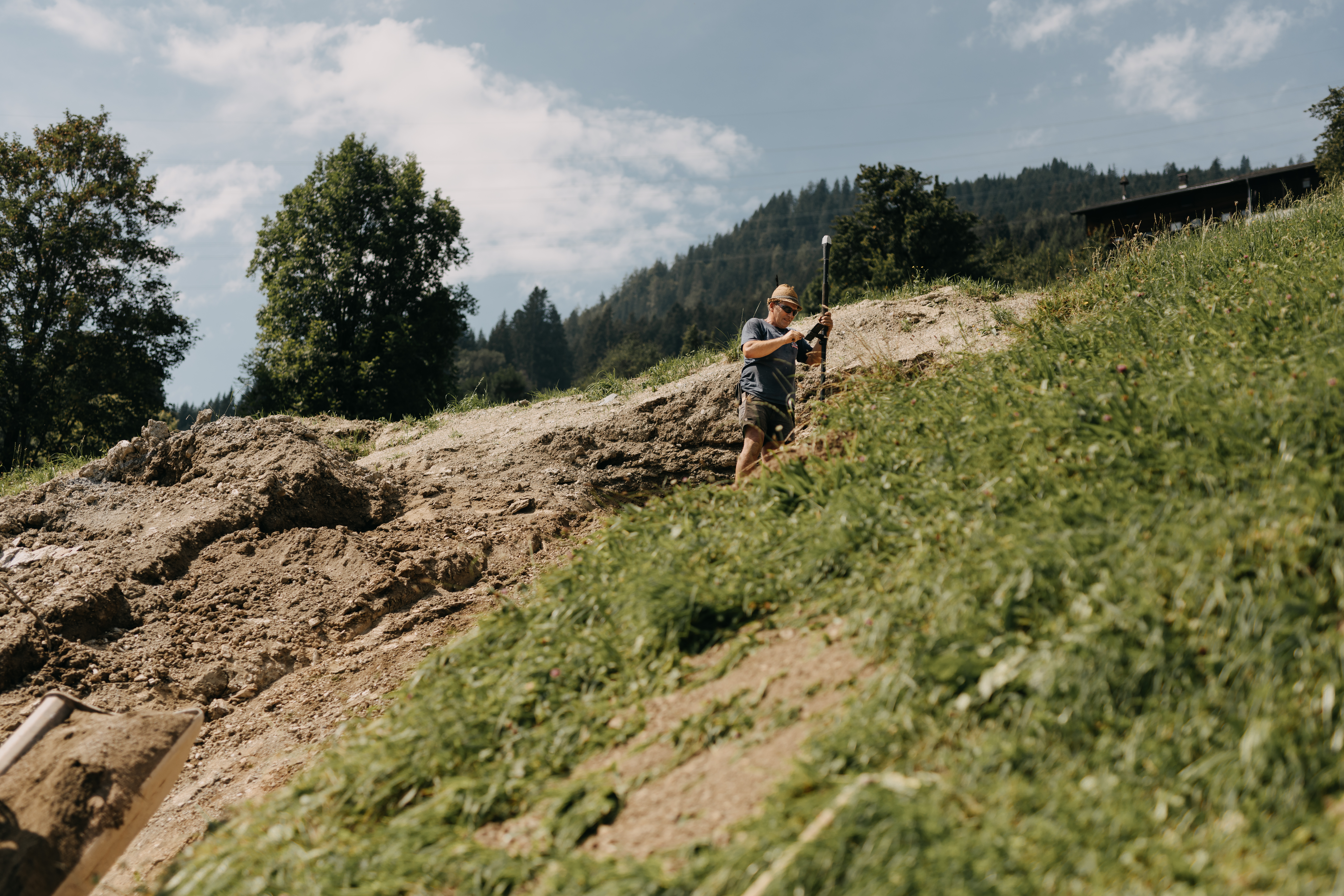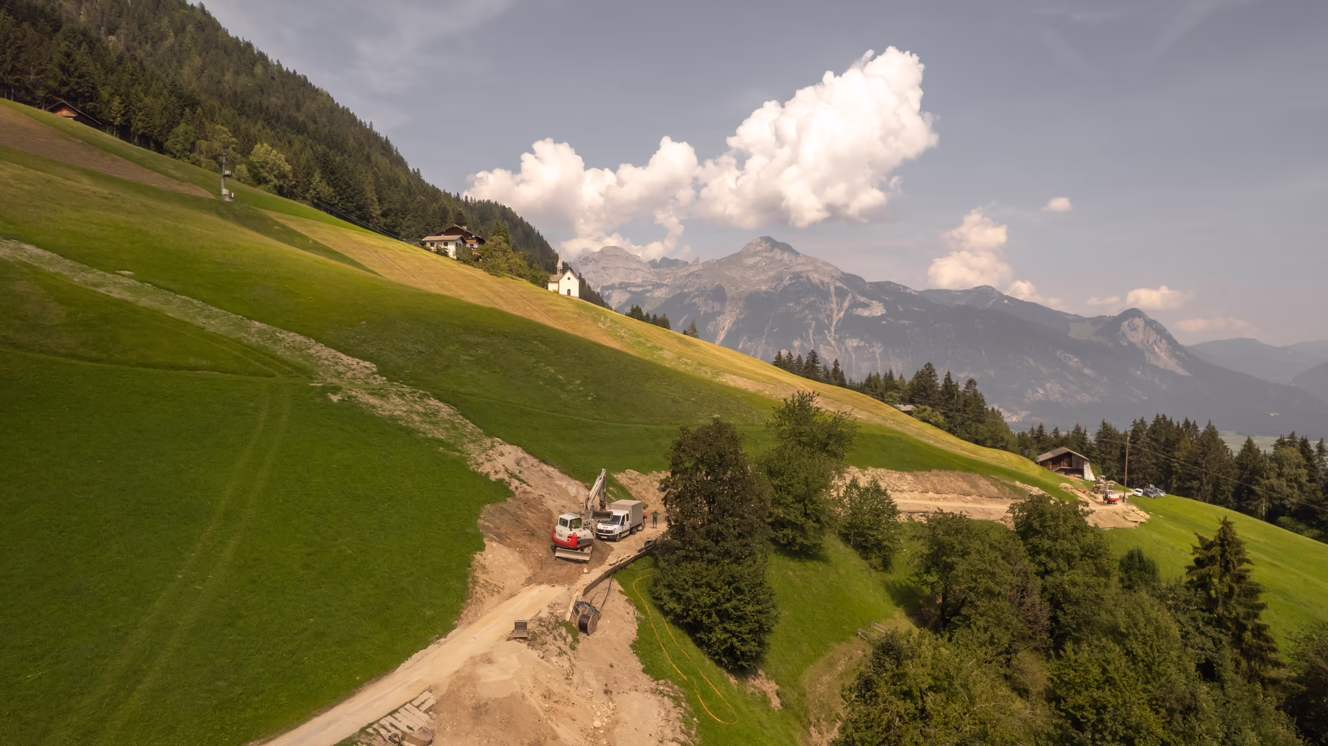 Von März bis Oktober 2024 ging es jedoch am halben Schlitterberg ein wenig geschäftiger zu als sonst – das RIEDER Tiefbau Team ließ auf einer Trassenlänge von circa zwei Kilometern keinen Stein auf dem anderen. Grund dafür war die Erschließung sowie Verlegung von 3,2 km Rohrleitungen für Schmutz- und Regenwasser sowie der Anschluss von neuen Trinkwasserableitungen vom Mentelweg bis zum Martelerhof. Zudem verlegten die drei Männer 1,5 km Leerrohre für LWL, errichteten Löschwasserversorgungen mit zwei Hydranten, bauten 18 Kanalschächte und eine Schmutzwasserpumpstation beim Mentelhof. Tatkräftig unterstützt wurde das RIEDER Tiefbau Team von einem 9-Tonnen- und einem 16-Tonnen-Bagger und so konnten alle Arbeiten für die Erschließung der zehn Häuser souverän abgeschlossen werden.