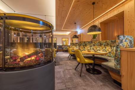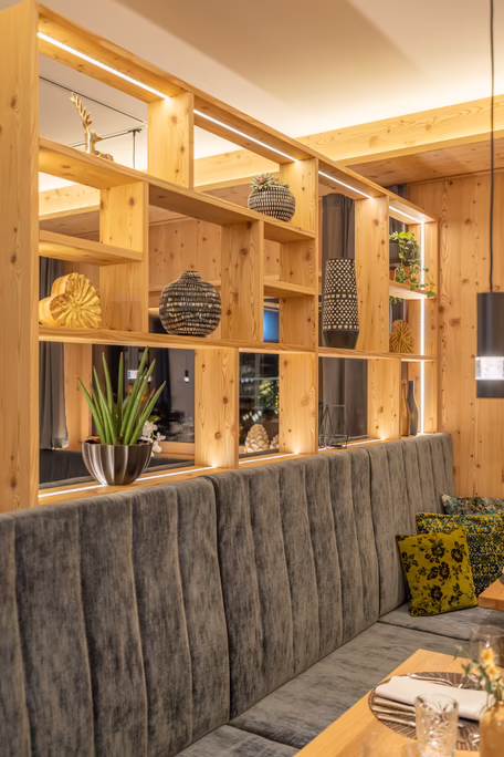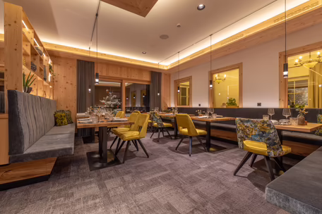 Von der Planung bis zur Fertigung vertraute die Hoteliersfamilie auf RIEDER Zillertal und den Möbelspezialist Engelbert Klocker mit seinem Team. Im Herbst 2022 wurde der Lärchensaal als letzter Speiseraum des Restaurants fertiggestellt. Hochwertige Fenster, edle Stoffe, viel Holz, modernes Interieur und raffinierte Details verwandeln den offenen Speisesaal in eine wohlige Stube.